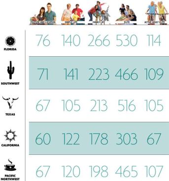 TOTAL U.S. NEW HOME CLOSINGS SINCE 2009These percentages reflect the households that could be identified from permit information. TOTAL U.S. PERCENTAGE OF NEW POOL PROJECTSFigures represent purchases made between 2009 and Q1 2012. TOTAL U.S. LIKELIHOOD INDEX FOR NEW POOLSThese figures compare purchasing likelihood to the average household, represented by 100. Feature and Location: Young professional singles and couples focused on their careers. Most are 25 to 44 years old, earning $50K to $150K. Their homes are generally worth $200K to $500K. They appreciate custom features and may sacrifice basics to buy desired items. They are price-focused when it comes to technology and style. They value convenience over price.