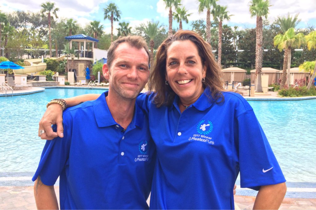 The pair took it in stride, striking various poses and trying to deliver their one line in unison into the camera –- “We are Pleatco’s 2017 Perfect Pool Guy and Gal!” -– bungling it multiple times to hilarious effect.
