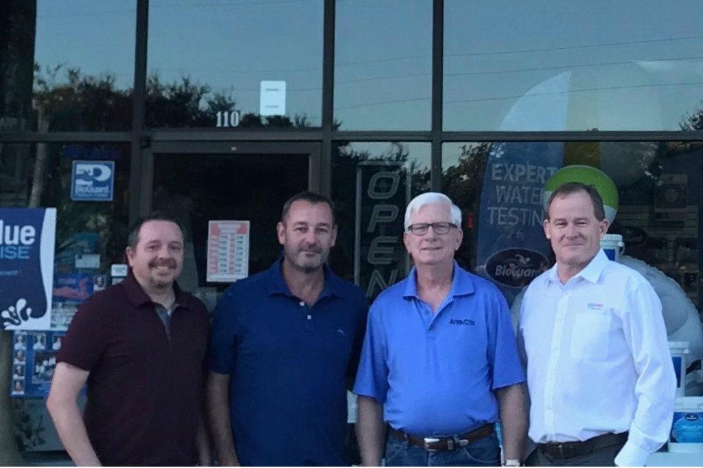 The former owners of California Pools, Ed and Karen Listol, are retiring from the industry. (Ed Listol is pictured second from right.) The new owners and franchisees, Thomas Gutierrez and Jeremy Swearengin (pictured from left), come from outside the industry.