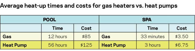 A 20-square-foot spa holding 500 gallons can be heated in just 33 minutes from 50°F to 102°F. In Sacramento, Calif., this would cost $3.50, according to SMUD. Many pool and spa owners consider these costs to be minimal compared to the speed at which the gas heater works.