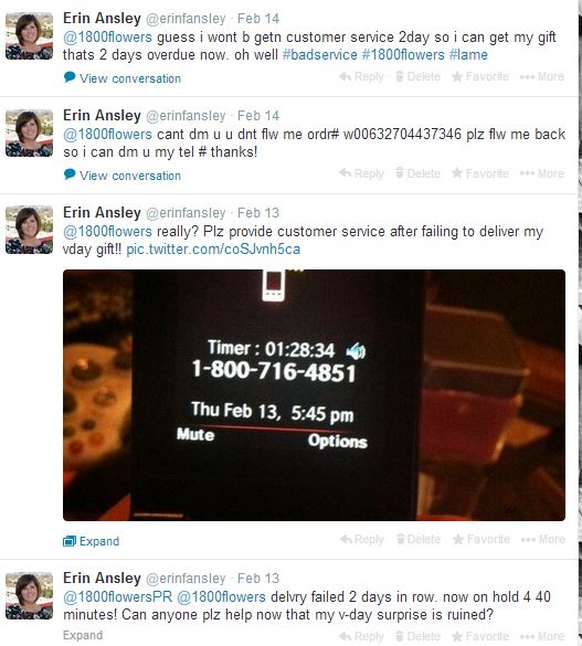 Twitter serves as a very powerful tool that not only facilitated a response from 1-800-Flowers, but provided a platform for me to vent my frustrations and have my voice be heard. I understand that Valentine’s Day is the busiest of the year for 1-800-Flowers. Yet, the company stayed abreast of its Twitter account when its phone lines were jammed. In the end, using the tool allowed the company to address a very dissatisfied customer and resolve an issue in a fairly expedient manner.