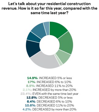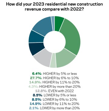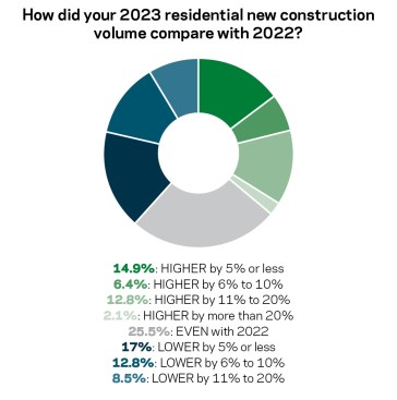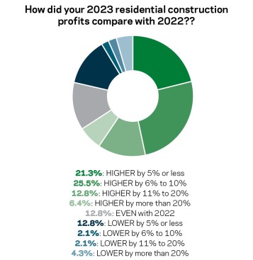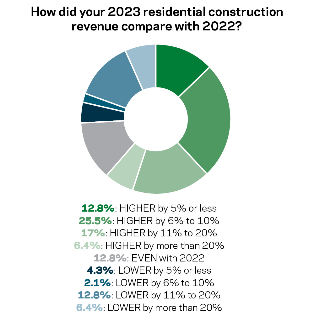 We start by looking at how these companies performed last year. Knowing that inflation can artificially boost contract prices,we did a comparison of residential construction revenue (top) to profits (immediately above). In both cases, the news was positive: A full 61.7% reported higher revenues than the year before, while 66% reported increased profits. For both revenues and profits, 12.8% said 2023 mirrored 2022. On the other hand, 25.6% saw lower revenues and 21.3% reported lower profits.