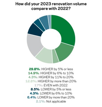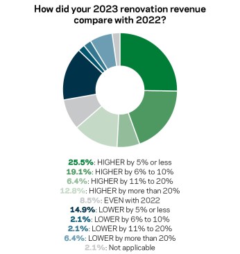 In the above two charts, we look at revenues and volume for renovations. Clearly more builders saw growth here than from new construction in 2023, but the numbers favored volume over revenue. Almost 62% performed more renovations in 2023 than in 2022, while relatively fewer, 53.8%, saw increased revenues from renovations, perhaps suggesting lower-ticket projects. But renovations clearly are on the rise. Of the Top 50 Builders, 43.8% reported performing more renovations in 2024, compared with the same time last year. Another 43.8% have done the same amount.