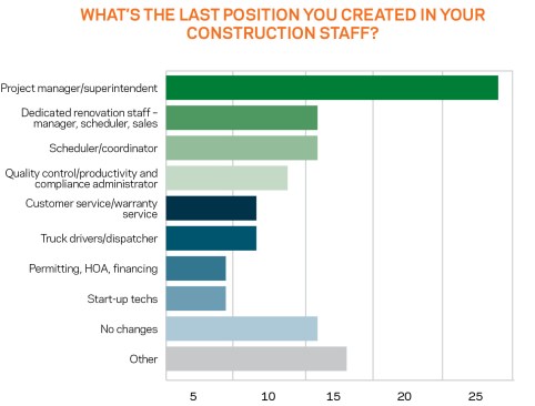 This chart shows what percentage of builders last created each position. Project manager/ superintendent was most popular by far, with nearly a quarter of respondents recently creating that position.In another question, Top 50 Builders were asked what position they’d like to create next. Here, too, project manager/superintendent/foreman stands at the top of the wish list.