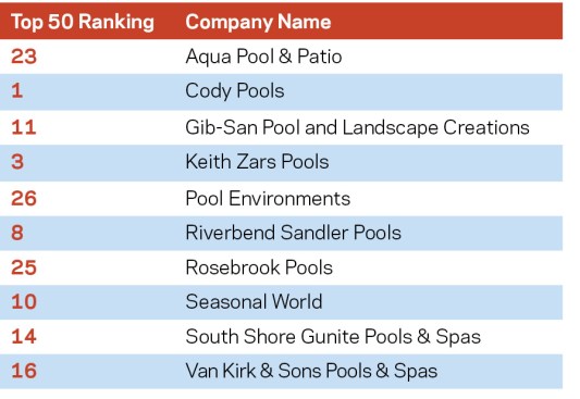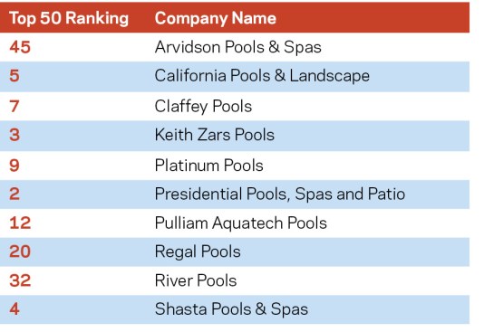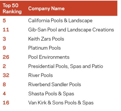 Residential Construction Revenue is calculated by combining earnings from new residential construction and renovations. Of the five judging criteria, this factors in the most. Once again, Cody Pools, headquartered near Austin, topped the list of highest earners. It generated nearly $50 million in residential construction, representing almost a 13% jump from last year’s $44.2 million. Cody is joined by five Lone Star State compatriots in this Top 10 list. Three of the remaining companies hail from Arizona, with the last from California. In residential construction, this year’s group earned $816.8 million, a 5% increase over the 2017 Top 50, whose reported residential construction earnings combined for $777.9M.