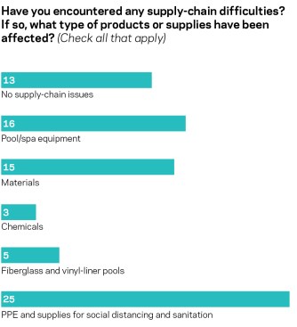 All but 13 of the 50 builders have experienced supply-chain issues. By far, the biggest hold-up has come from personal protective equipment, disinfecting products and supplies to facilitate social distancing. However, nearly one-third of these builders have experienced issues with materials and equipment.