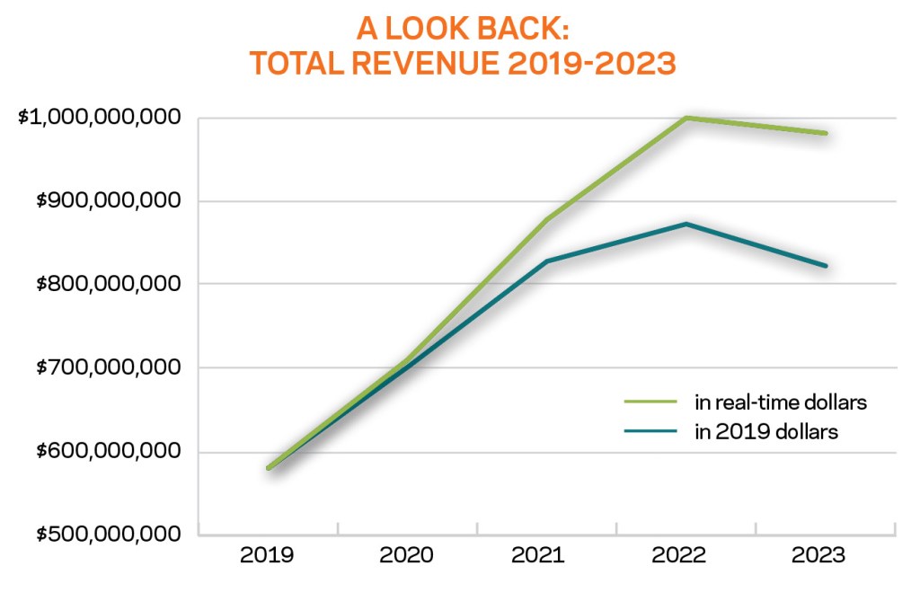Like so many in the industry, this group saw a peak in 2022. While 2022 to 2023 seems fairly stable, the drop is slightly more pronounced in 2019 dollars.