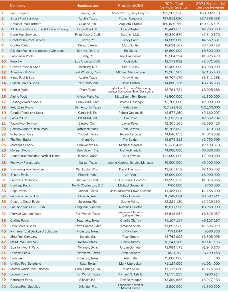 It is our honor to recognize this year’s PSN and Jandy Top 50 Service companies — a group that continues to demonstrate the increasing vitality of this pool/spa industry sector.