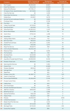 This Top 50 list includes businesses of all models — from large-scale national firms to independent service companies to service departments of multi-disciplinary outfits. It reflects a new reality — the ever-increasing presence of consolidators in the pool/spa service sector. These companies, which purchase existing independent firms to spur quick growth, took top spots in this year’s list, reflecting high scores in the five scoring categories: revenue, training programs,internet presence, industry participation and community involvement.