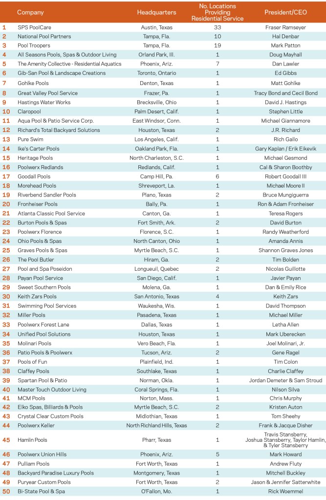 This year’s is truly a diverse group. As with the industry itself, national consolidators are making their presence known, taking top spots on this list. We have individual franchisees, companies that also work in the construction and retail sectors, as well as independent single-location companies dedicated to maintaining and repairing swimming pools and spas. While residential service makes up the bulk of their work, some of these firms do specialize in commercial service.