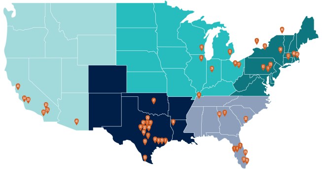 The map below shows the regional distribution of this year’s Top 50 Service companies. Each tab represents one firm, showing its headquarter city. Numbers on the tabs indicate company ranking. Once again, Texas is well-represented, holding 15 of the slots, or 30%.