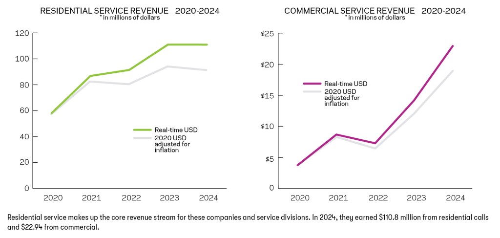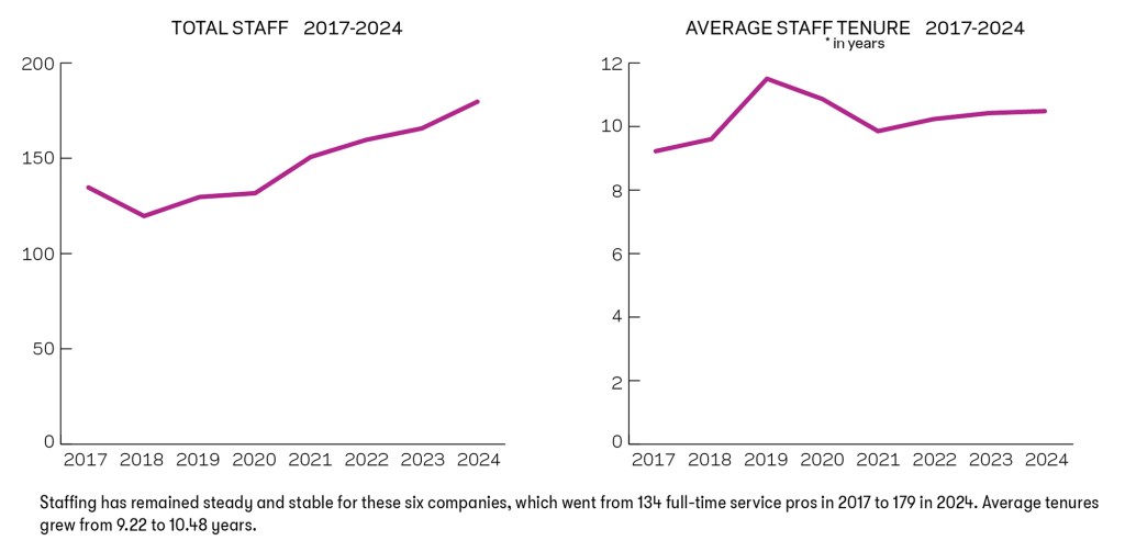 In the hopes of producing a microcosm of the industry to see how it’s fared, we’ve pulled and tracked the data supplied by each of these companies. For our five-year group, we look at their data from 2020 to 2024 (while they appeared in the lists from 2021-2025, they provided data from the year before.) While most of their metrics show inclines in the five years, only average staff tenure has seen a reduction.