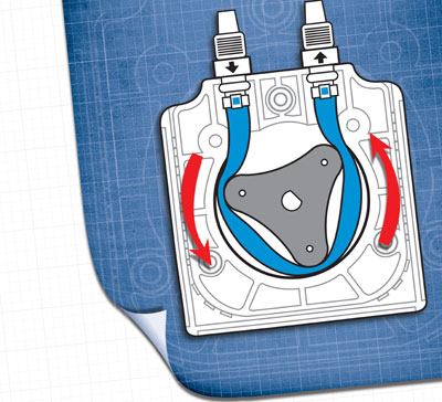 The mechanical simplicity of these pumps offers several advantages. “A peristaltic pump is completely self-priming,” says Kevin Boyer, COO of Aquasol Controllers Inc. in Houston. Boyer adds that a peristaltic pump also works quite well with gassing liquids like bleach, because its design simply pumps any gas, along with the liquid, right through the tube and into the line.