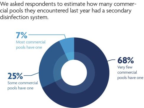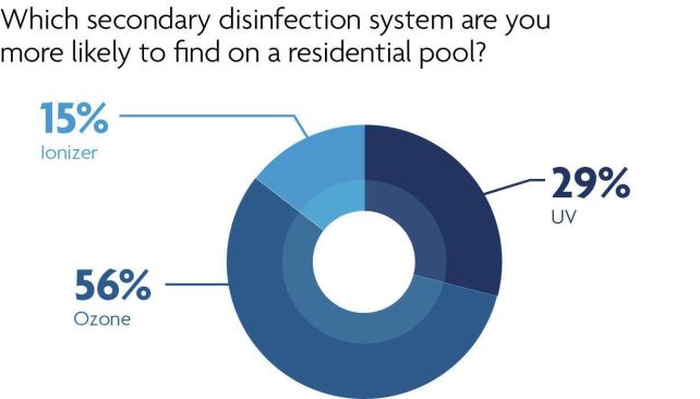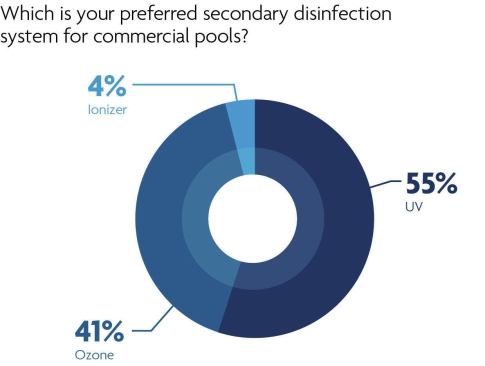 Ozone, however, has its fair share of fans, as well. Asked which system is more commonly found at commercial pools, 51 percent of respondents said UV and 43 percent said ozone, with the remainder going toward ionizers.