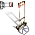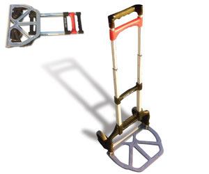About a year ago, I ran across a hand cart at the home improvement store. When you fold up the piece that holds the weight, it tucks the wheels in, and then the handle collapses on itself. It’s about 18 inches wide by a couple feet tall when it’s unfolded. And it folds up so small, I can stick it behind the front seat of my truck.