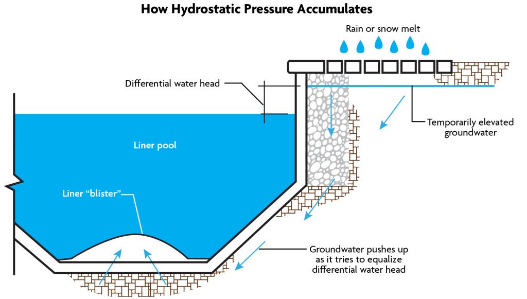 If the surrounding landscape doesn’t provide proper drainage and shed water away from the pool, then water will collect around the perimeter from rain and snowmelt. This accumulation will eventually connect with groundwater and potentially swell above the pool’s water level, generally 4- to 6 inches below the ground. The water levels in the pool and ground will want to equalize. A downward pressure from the surface causes the groundwater to exert pressure up against the shell.