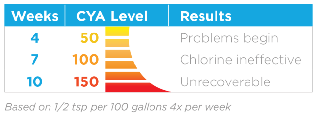CYA keeps the chlorine in the water up to eight times longer. Pools that used to need daily chlorine additions now only need chlorine once a week with CYA. However, chlorine in the water quickly binds to CYA and a smaller portion of the chlorine is available. So, the chlorine is around longer but it does not kill as quickly. And as the CYA increases, there is less and less chlorine available for killing bacteria and microorganisms.