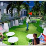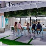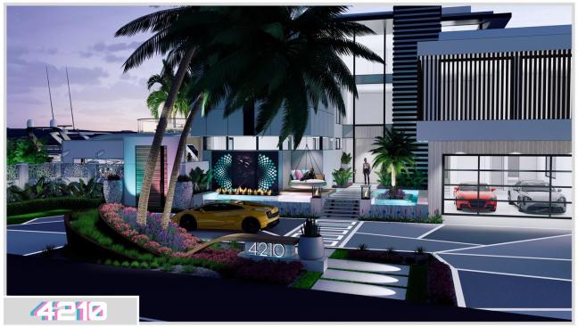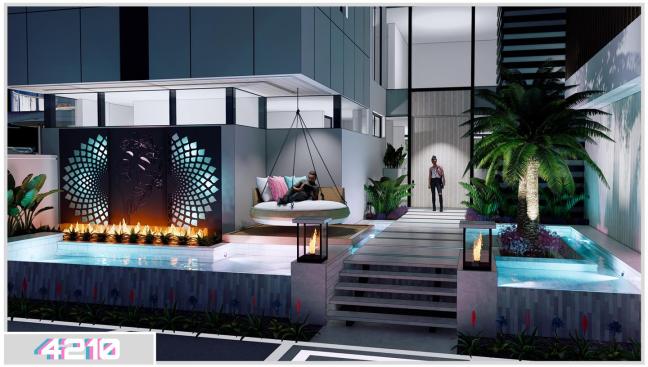 Holley put the main pool next to the structure, with an acrylic spa across from it, set on the centerline of the hardtop structure. The pool floor features a tile mosaic of Frida Kahlo, as just one of several works of Latin-inspired art. Another such piece could be found at the splash pad, which featured a South-American two-headed serpent sculpture.