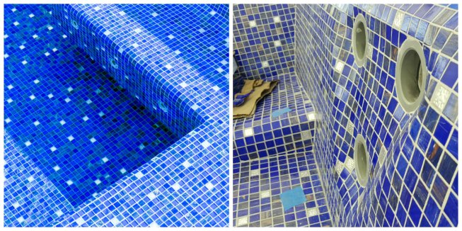 Details in azure: Chafey and Blauvelt chose an intense blue glass tile to convey a richness that would have otherwise required significantly more water depth to achieve. “We wanted to stick with the theme, but we really wanted it to be obvious from the ground that you weren’t just looking through a glass panel and seeing nothing,” Chafey says. “The look is pretty impressive with that color of blue coming through the panel.” Crews took steps to make the benches as comfortable as possible, such as rounding all corners and recessing some of the jets so they would not dig into the back.