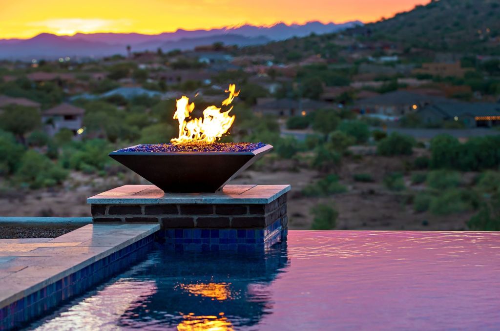 Fire features make up some of the most popular additions to today’s pools and backyards. It’s hard to resist the ability of flame to transform the space at night by casting its warm light on the landscape, its reflection on the pool, and added sparkle on falling water.