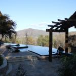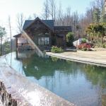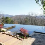 Sweeping View: The 77-foot-long vanishing-edge pool forms a swee… Sweeping View: The 77-foot-long vanishing-edge pool forms a sweeping arc connecting the main house with the guest house, seen in the top image. A black pebble finish adds to the reflective quality and adds a modern touch, while the Tennessee fieldstone deck ties with the home’s rustic materials.