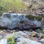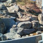 A flat stone chosen to create a wide fall. Some of these larger … A flat stone chosen to create a wide fall. Some of these larger specimens were cut to fit against the walls of the concrete basin.
