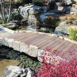 Point of connection: Dorsey designed an Ipe bridge to circulate … Point of connection: Dorsey designed an Ipe bridge to circulate traffic from one deck to another and connect the stream with the pool. He didn’t want handrails on the bridge to obstruct the view so, instead, he created an edge using the same stone that veneered the dwelling structures. The bridge also helps create the illusion that the stream flows into the pool. Underneath the bridge is a wall separating the two vessels. At that point, water from the stream is pumped back up to the originating pool. On the other side, inlets supply water to create the small drop into the pool.