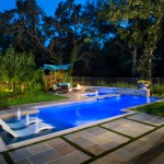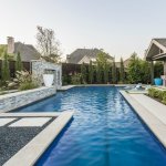 The pool pictured below needed a modern style that, at the same time, would complement a French country home. The clients wanted the sleek lines of a modern, but with softer materials. Pennsylvania bluestone on the floating step pads and travertine on the deck add some texture to the clean lines. The raised wall in back features the trademark thin, horizontal stone pattern, but with a chiseled finish on the face.