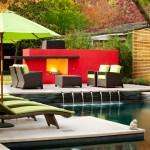 In this renovation, the pool retained its original shape. Angell and Pool Environments added an elevated deck in back, along with the boldly colored fireplace.