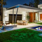 Here, the pool is centered on a line that dissects the home’s front door and sliding glass doors. The back of the spa, which sits at ground level behind the raised wet deck, lines up with another glass door coming from the home. Angell created another invisible line by centering the wet deck, spa and dining table with the cutout found in the pavilion’s back wall.