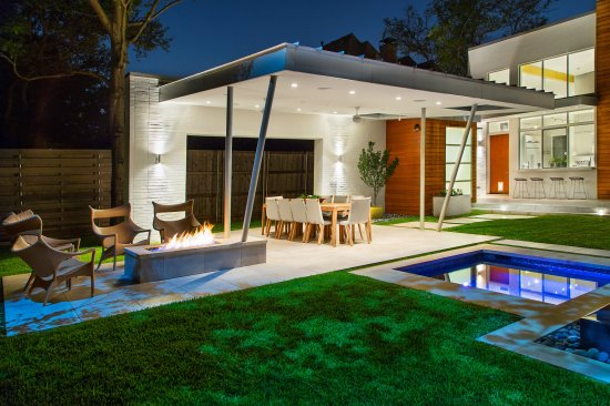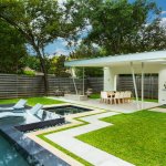 Mexican river pebble in the gutter and the outer line of beige stone help warm the cool tones inside the pool. But a long-held practice in modern backyard design plays an even more important role in creating a sense of peace: Aligning the pool and other primary elements with critical axes drawn from the home.