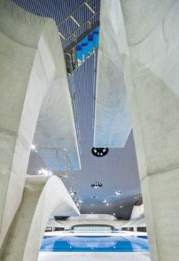 Design DetailsLike its predecessor the Water Cube, the London Aq… Design DetailsLike its predecessor the Water Cube, the London Aquatic Centre is designed with an eye toward aquatics and the fluidity of water in motion, but it avoids cliché. Sulfur yellow, one of the official London 2012 brand colors, was used to accent the gray stain applied to the building to give it a consistent, weathered-finish look. Succumbing to using the blue associated with pools would have been too obvious, says the designer.