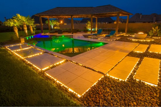 Pavers with a tile overlay are something of a specialty for Morehead Pools in Shreveport, La. And in this case, the architectural ground cover provided the perfect solution for low-profile lights. Brandon Brice, landscape lighting designer and owner of Red River Lights, also in Shreveport, came up with the clever idea of affixing surface-mounted LED strips under the tile overhang, casting a soft warm glow around each square.