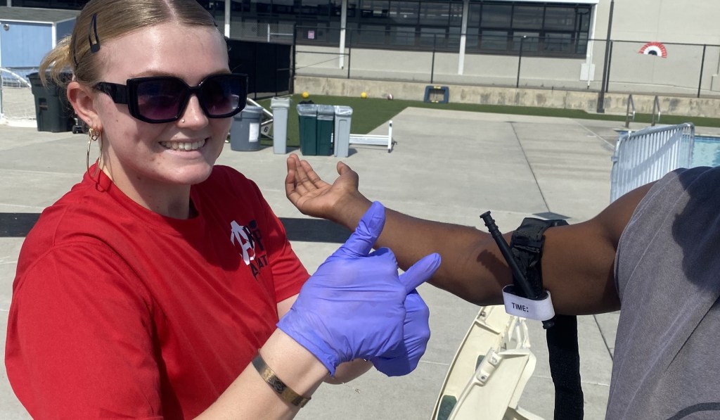 SELF-APPLICATION: Lifeguards are paired up (one will be the rescuer/victim, one the proctor). Bleeding control and tourniquet supplies are available. The proctor will identify the limb or area that has severe bleeding.