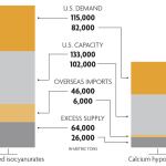 Water treatment also is big business; the wholesale market for pool chemicals during the industry’s peak in 2007 was $2 billion, according to Chemical and Engineering News. Domestically, just a handful of companies —Arch Chemicals, a Lonza company; Clearon Corp.; Occidental Chemical Corp.; and Axiall — control most of the production of cal hypo and chlorinated isos. It adds up to lots of chlorine compounds — more than the American market needs, actually. According to Eisenhauer, the U.S. has the capacity to manufacture more than enough chlorinated isos (133,000 metric tons) and cal hypo (102,000) than required. (See “Supply and demand” chart.)