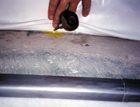 2. First attach the vinyl liner to the pool’s poured concrete steps. A fiberglass step rod is slid through a sleeve that has been electronically welded to the back of the liner. Concrete anchors have been installed where the risers meet the back of the tread of the step. A stainless steel screw is then put through the rod and into the anchor.