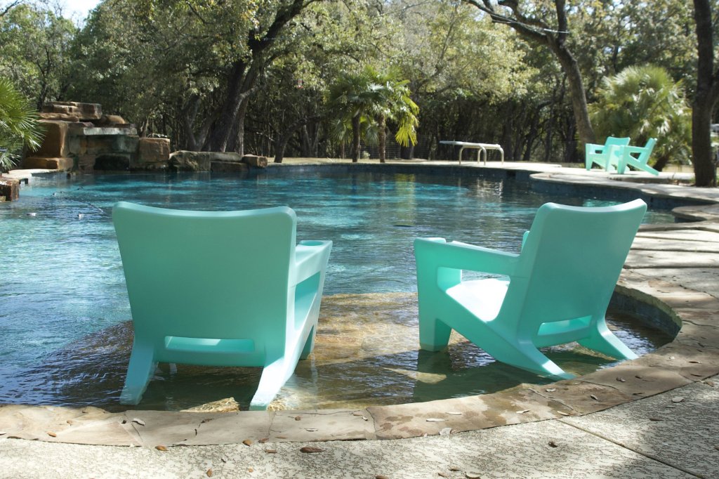 The Costarondack in-pool chair by Bask Outside has been modified to incorporated holes in its feet to easily let water in for stability when in the pool and to let water out when taken out of the pool.
