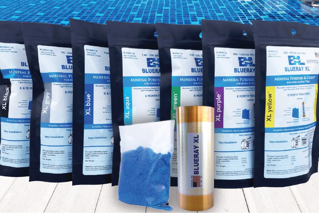 Blueray XL is sold trade-only and is a copper-based pool product registered as an adjuvant. Blueray XL is a silver, copper, and zinc formulation. An ion-exchange silver alloy cylinder increases overall chemical efficiency and removes anionic contaminants such as phosphates, pollen and other inanimate waste for 6 months, per maker.