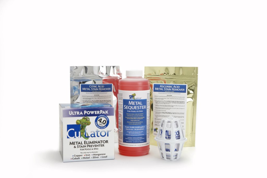 The no-drain Metal Stain Eliminator Kit for pool and spas includes materials to remove iron and copper metal stains, sequester those metals with a non-phosphate sequestering agent, and eliminate the metals with a CuLator Ultra 4.0. Each kit includes complete instructions and treats 20,000 gallons. Works on a variety of surfaces.