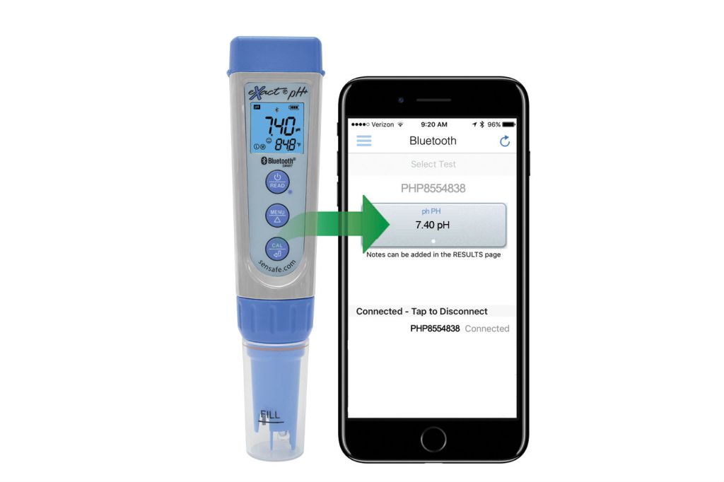 The new eXact pH+ Smart Meter System with Bluetooth SMART is a handheld multi-parameter pocket meter that can detect pH, conductivity, salinity, TDS, temperature, and ORP in water. Used in conjunction with the eXact iDip app for iOS and Android smart devices, it can give users automatic calculations of formulas.