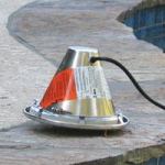 2 | It’s time now to remove the light fixture from the niche. From the edge of the deck, lean over and loosen the screw. Once it’s unfastened, the fixture should pop right out of the niche. The NEC requires at least 4 feet of cord, so you should be able to pull the entire fixture right up onto the deck. |