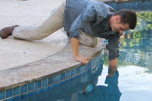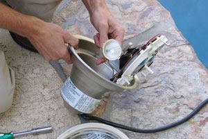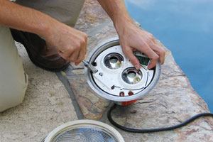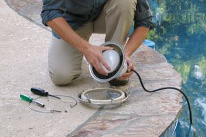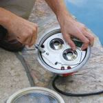 7 | Before putting the light back into the pool, turn the power on and check if the bulb illuminates. Do this quickly or the bulb will overheat and break. You can destroy internal components if you leave it on too long while it’s out of the water, experts warn. But some models have a built-in thermal cycle switch, which is preprogrammed to shut down at certain temperatures. If the light works, you can now prepare to place the fixture back into the niche in the pool wall. Remember to turn the power off again before undertaking this step. |