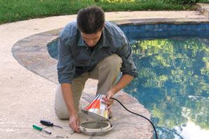 1 | Shut down the power to the pool. You don’t want to be working with live wires around the water. If the subpanel is not within the line of sight from where you will be working, close it up and lock it, or place a sign on it. Write something such as: “Warning: Electrical pool work under way. Do not turn on power!” The last thing you want is a pool owner coming home and turning the power back on while you’re working. |