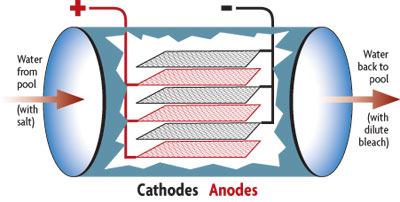 For example, when common salt — known chemically as sodium chloride (NaCl) — dissolves in water, it splits up into two ions — positively charged sodium (Na+) and negatively charged chloride (Cl–). As electric current passes through salt water, electrons are ripped away from the chloride ions and pulled toward the positive charge of the anode. The removal of these electrons converts the chloride ions into neutral chlorine atoms, which are then able to join into molecules of electrically neutral chlorine gas (Cl2) — one form of the commonly mentioned “free available chlorine” that acts as an oxidizer in swimming pools.