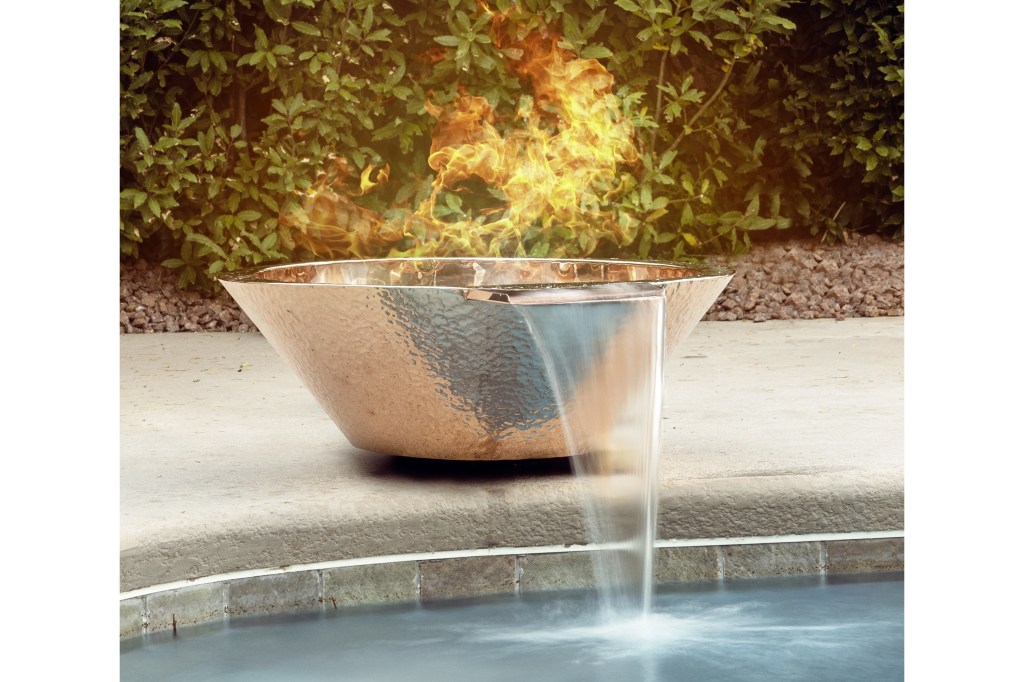 The Diamond Series 30” Fire and Water Bowl from Outdoor Fire Concepts is made from 16 gauge metal (copper or stainless steel) with authentic hammered finish and silica/ceramic clear coat making it impervious to oxidation or weathering of any kind