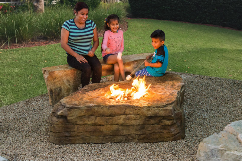 The new stand-alone Boulder Firepit unit is ready to ‘plug-n-play’ in any backyard living space. It offers a 12-inch stainless steel fire ring that can be used with glass or lava rock. The unit measures 63-inches long by 48-inches wide and is 15-inches tall, weighing about 300 pounds.