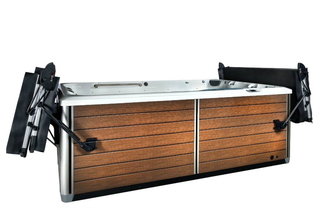 Smartop Vanish is an integrated hydraulic cover lifter system that positions the cover to the sides of the spa, making it vanish from view when the spa is open. It requires just 25 inches of clearance behind the spa. A rigid polymer exterior guards against water absorption.