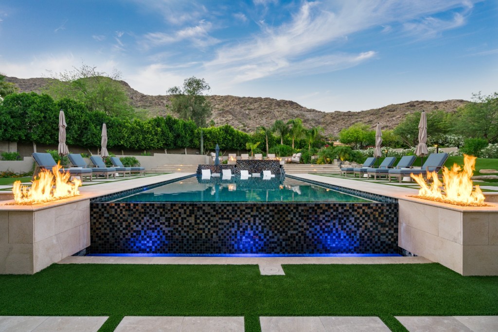“As you look [from] the spa, it looks like the water is spilling into the fire,” Tipton says. “And when you’re looking up at the pool, it looks like the fire is floating on the water.”