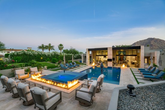 The waterscape needed to not only showcase the hills and mountains of northern Phoenix, but also carry the view indoors, as 20-foot-high sliding glass doors would essentially blend the indoor and outdoor spaces. Needless to say, materials and lines had to reflect the modern home.