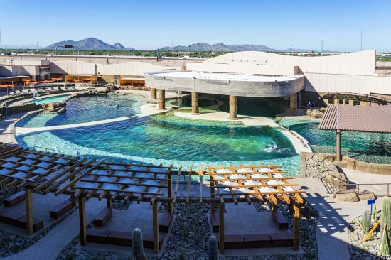 The complex includes two pools sheltered by a windowed structure that can open up, essentially converting the pools from indoor to outdoor. This not only provides an option for humans during cold winter days — which they do have in Arizona, if only occasionally — but the structure benefits the dolphins. For instance, if a dust storm should occur, operators can corral the animals indoors while the event passes. Then the water would need to turn over, which takes about an hour, before the dolphins are released outside. This protects their health. “Dolphins don’t have filters,” Fletcher says. “Everything goes in the hole on top for air, and you can’t get that plugged up.”